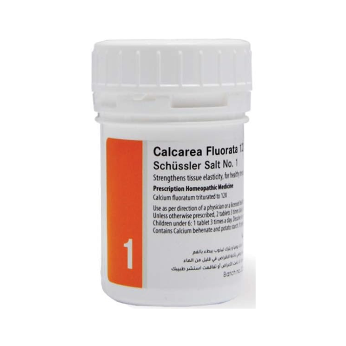 Schuessler Salt Calcarea Fluorata 1 12x Tablets contains calcium fluoratum triturated homeopathically to 12x. Schuessler Salts disintegrate and dissolve easily in mouth, making them very convenient to take on regular intervals. If necessary, they may be dissolved in a small amount of water, and then be sipped slowly.