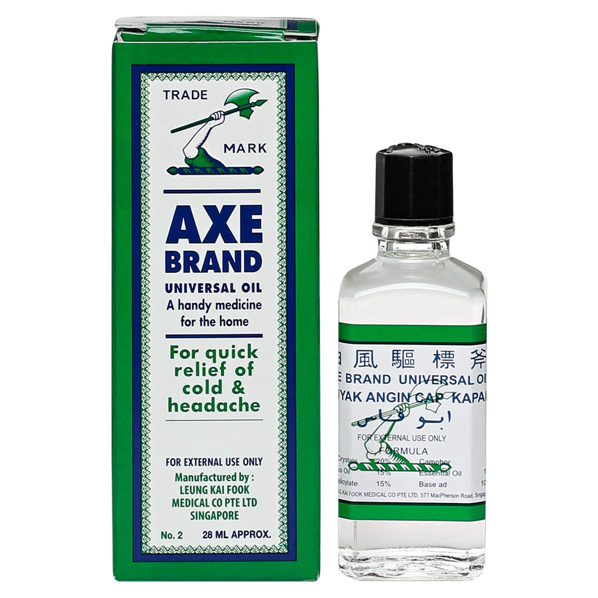 Axe Brand Universal Oil 28 ml Condition: NEW In Box, Sealed Original Packing Volume,28ml per bottle. Axe Brand Universal Oil (also known as Axe Brand Medicated Oil in some countries) is made from a unique formula and has been used throughout the world for nearly 60 years. It is pure in color, pleasant in odour. It is mild yet suitable for use by both adults and children for relief of giddiness, headaches, travel sickness, stomach-ache, insect bites, rheumatic pain, muscular pain, blocked nose and cold.