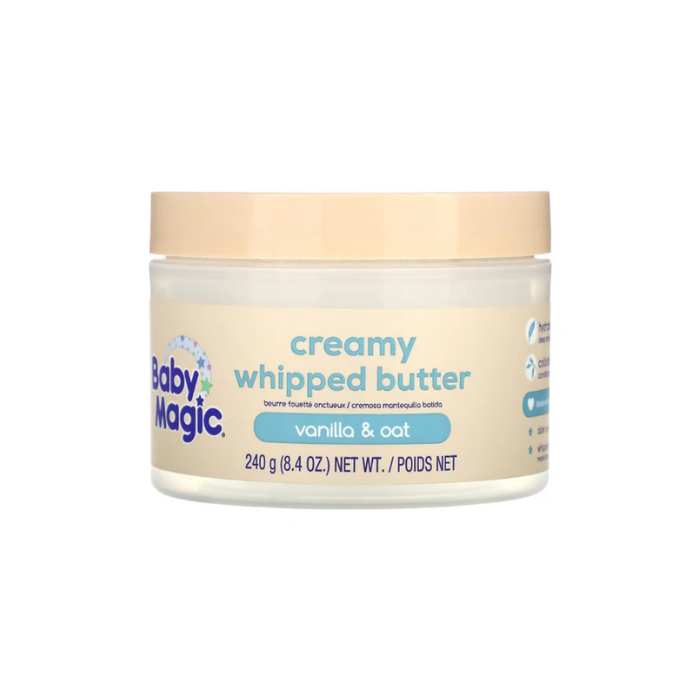 Baby Magic Creamy Whipped Butter provides gentle care for baby's precious skin and soothing comfort for the whole family. This silky, feather-light whipped formula absorbs quickly and provides deep, long-lasting moisture. The Vitamin-enhanced body butter is full of nourishing ingredients like colloidal oat, aloe and shea butter and leaves behind the comforting scent of vanilla and oat. Creamy Whipped Butter is made with colloidal oat, known to soothe and moisturize dry, sensitive skin. Creamy Whipped Butter is gentle enough for everyday use on baby's sensitive face and body.