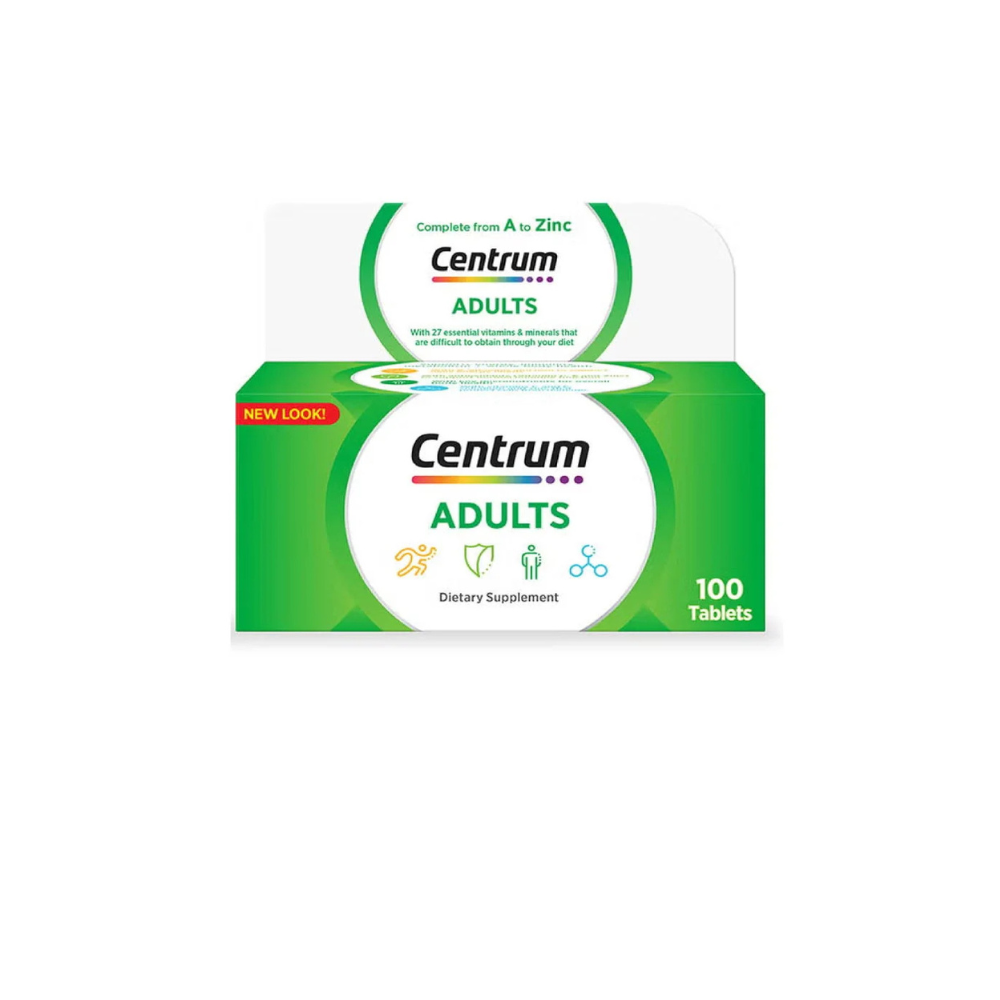 Centrum Adult 100 Tablets is a complete daily multivitamin formulated to support full-body health and meet modern nutritional needs. Designed for adults with busy lifestyles, it provides 27 essential vitamins and minerals to help fill dietary gaps and maintain overall wellbeing. This balanced formula delivers key micronutrients for energy, immune support, metabolism, vitality, and healthy cell protection. With B-Vitamins and Iron to support daily energy levels, plus antioxidant vitamins C & E, Selenium, and Zinc to help protect cells from oxidative stress, it promotes optimal everyday health.
