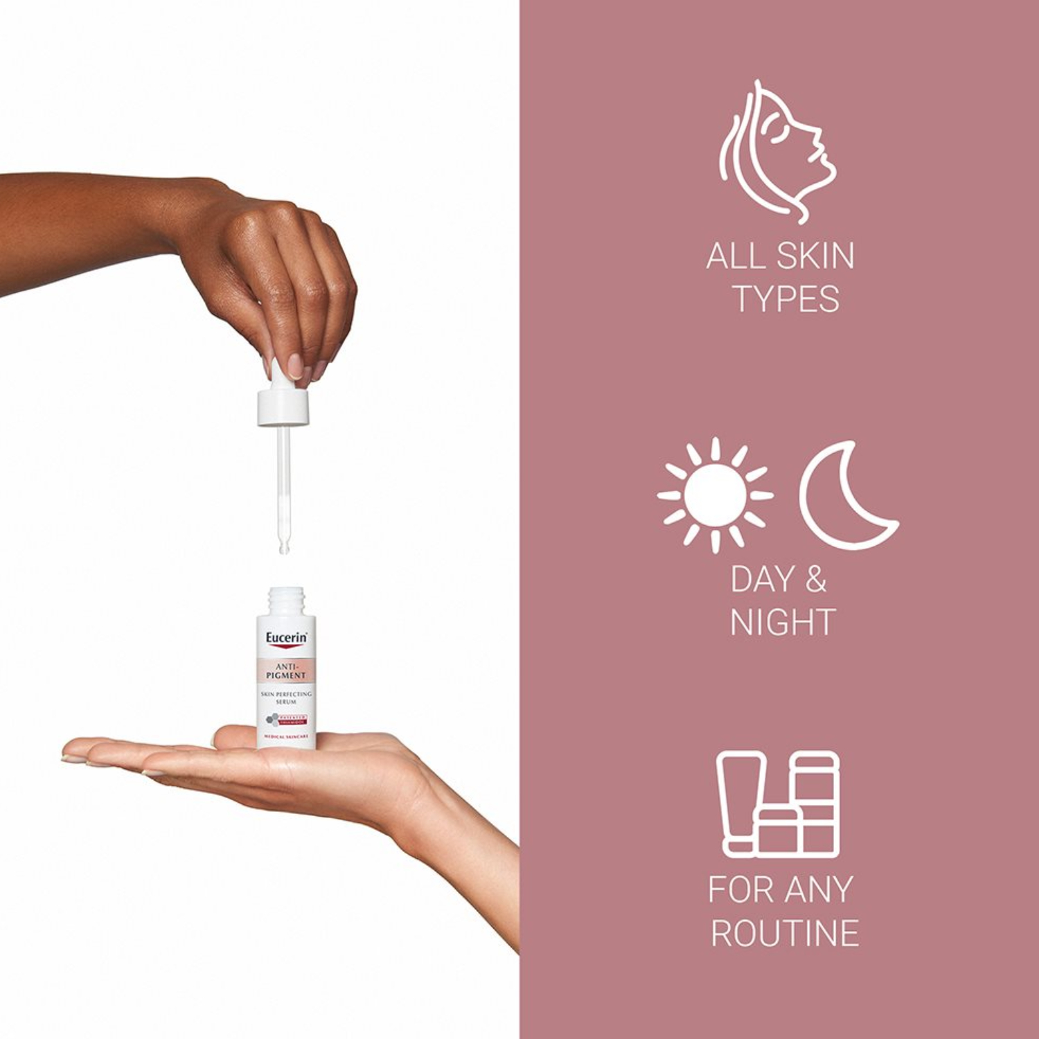 - Receive Complete Care : Discover the entire Eucerin Even Pigment Perfector range to provide complete care for even, radiant skin – 1) Day SPF 30 2) Skin Perfecting Serum 3) Night Cream 4) Dark Circle Illuminating Eye Care.