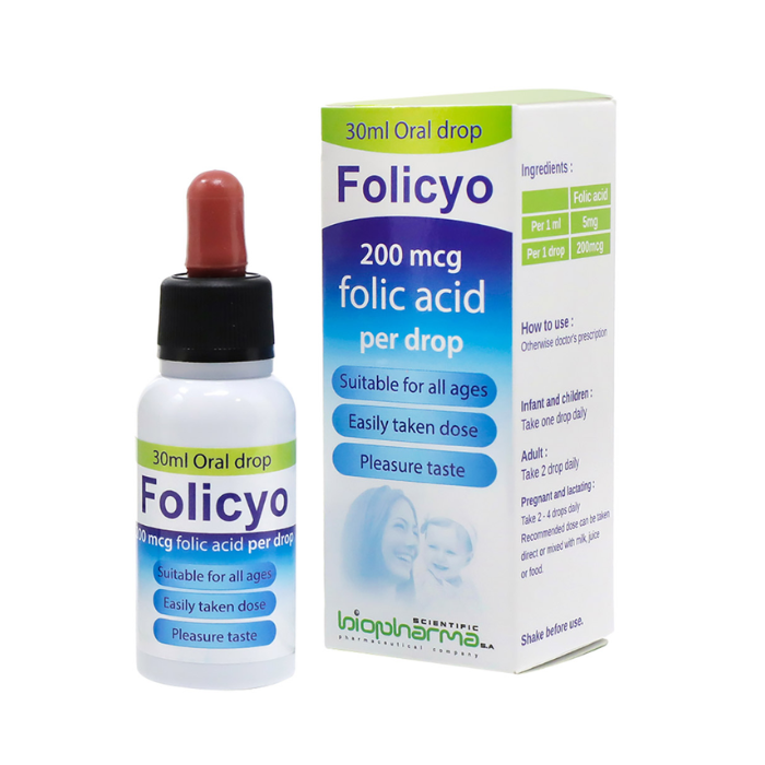 30 ml in plastic bottle with dropper in carton box. Folicyo is unique dosage form of Folic acid as oral drops, each 1 drop contains 200mcg Folic acid. Suitable for infant, children, adult & elder (as prescribed by doctors). Pleasure taste & easily administrated dose.