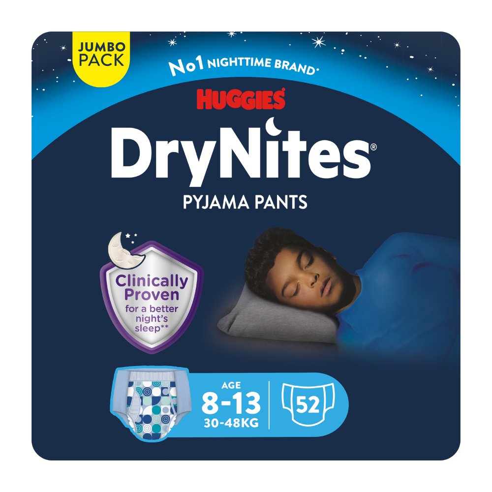 Did you know that up to 1 in 10 children wet the bed? DryNites are special, discrete pyjama pants designed to help parents sensitively tackle this stage in their child's development. A solution especially designed for bedwetting children, featuring an absorption capacity based on the age range. A good night's sleep assured, with Unbeatable night-time protection.