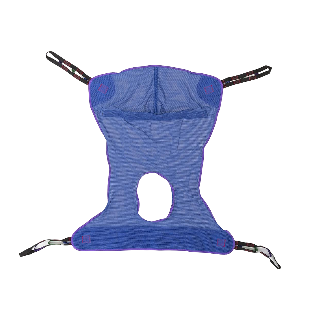 An easy sling to use while transferring the patient from the bed to a wheelchair, toilet or shower chair or from floor to bed. It offers total head and neck support and the padded lower section provides additional under-thigh comfort and support. Use the full body sling for patients who are totally dependent, partially-dependent, non-weight bearing, very heavy or have limited head control. Use this sling for amputee patients (in a reclined position).