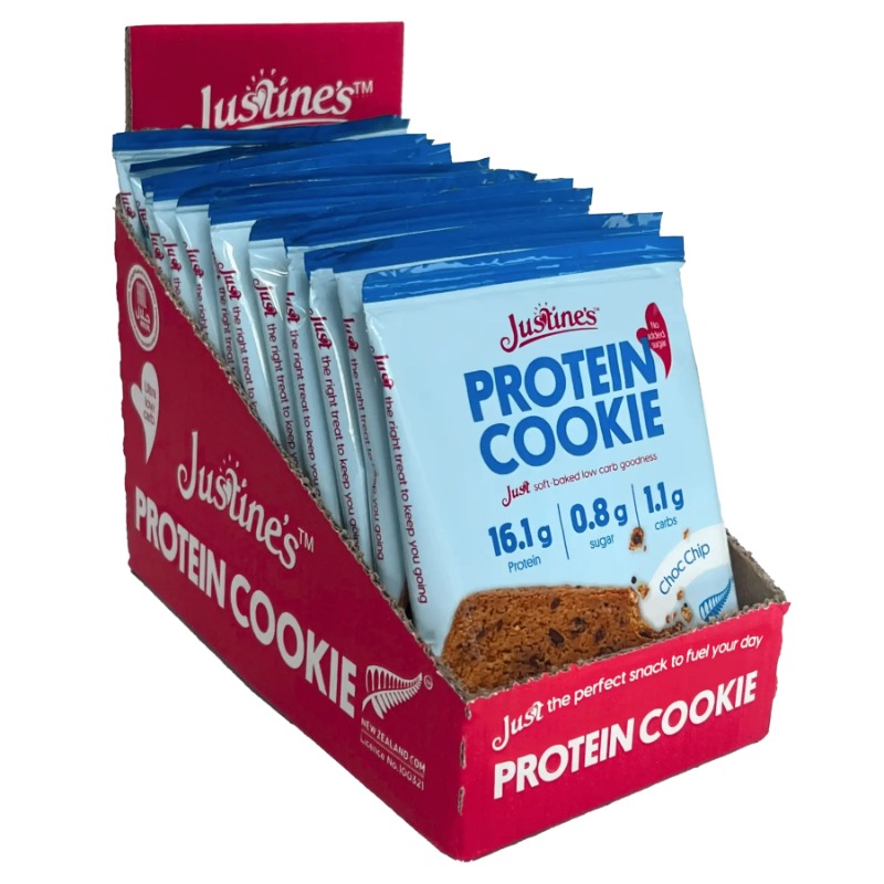 Ingredients : Justine’s Protein Blend (47%)(Calcium Caseinate (From Milk, With Monoglycerides), Almonds, Egg), No Added Sugar Dark Compound Choc-type Chips (12%) (Sweetener (Erythritol), Vegetable Fat (Palm Kernel Oil (Contains Emulsifier (Sorbitan Tristearate))), Cocoa Solids, Soy Protein Isolate, Emulsifier (Soy Lecithin), Natural Vanilla Flavour), Sweetener (Erythritol), Vegetable Oil Spread (Palm Oil, Coconut Oil, Water, Salt, Emulsifier (Mono And Diglycerides Of Fatty Acids, Soy Lecithin), Antioxidant (Mixed Tocopherols Concentrate), Natural Butter Flavour, Acid (Citric Acid), Colour (Carotene)), Bulking Agent (Polydextrose), Humectant (Vegetable Glycerol), Natural Vanilla Flavour, Emulsifier (Soy Lecithin), Baking Powder (Contains Raising Agents [Sodium Acid Pyrophosphate, Sodium Bicarbonate]), Sea Salt.