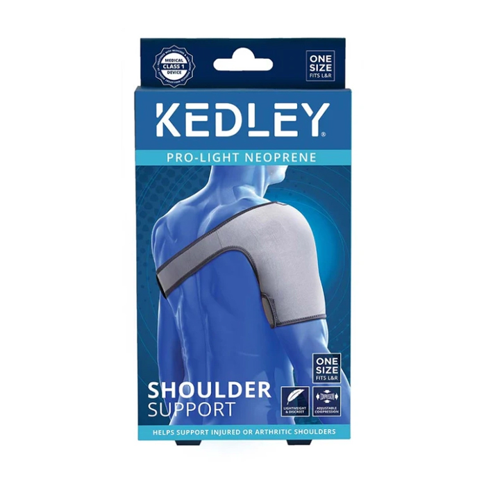 For support, compression and heat retention around the shoulder. Intended uses can include but are not limited to rotator cuff injuries, instability and weak or arthritic shoulders. The Kedley Shoulder support has two adjustable fastening points which help enhance the fit and assist with positioning of the support to maximise the stability of the shoulder.