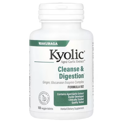 - Kyolic Formula 102 herb and enzyme blend, contains a unique natural and synergistic combination Aged Garlic Extract, Ginger, Glucanase, Lipase and Protease to support internal cleansing, healthy intestinal function and digestive balance.