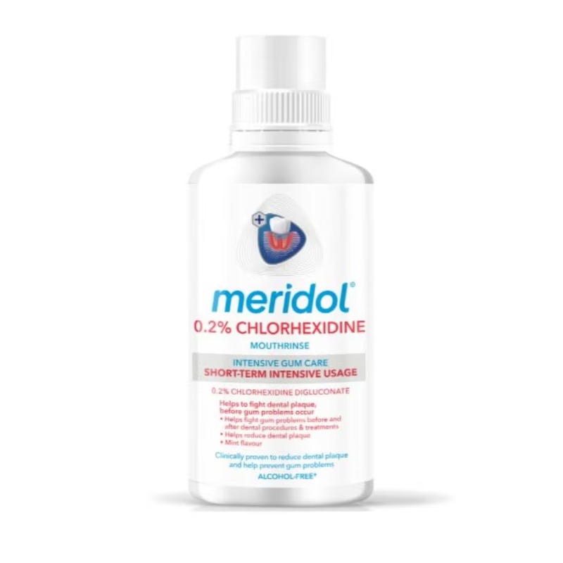 Meridol Chlorhexidine 0.2% Mouth Rinse 300ml is a clinically proven medicated mouthwash formulated with chlorhexidine digluconate (0.2%), a trusted antibacterial agent used to significantly reduce harmful oral bacteria. Designed to protect gums, reduce plaque formation, and support oral hygiene before and after dental treatments, this alcohol-free formula helps manage gum irritation, bleeding, and inflammation. With its mild taste and ready-to-use liquid format, it offers effective short-term gum support and bacterial reduction without causing oral mucosa irritation. Ideal as an adjunct to daily brushing, especially during periods of reduced oral hygiene or post-periodontal procedures.