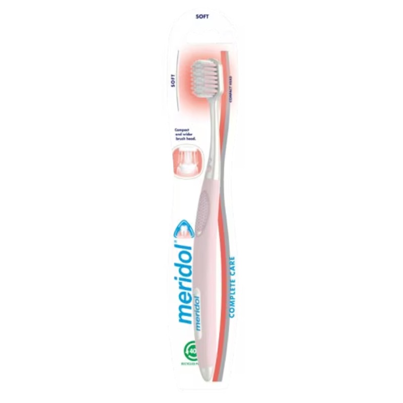 Meridol Complete Care Toothbrush gently massages around weakened gums. Designed for sensitive gums and teeth, it offers a superior clean and a more comfortable feeling.