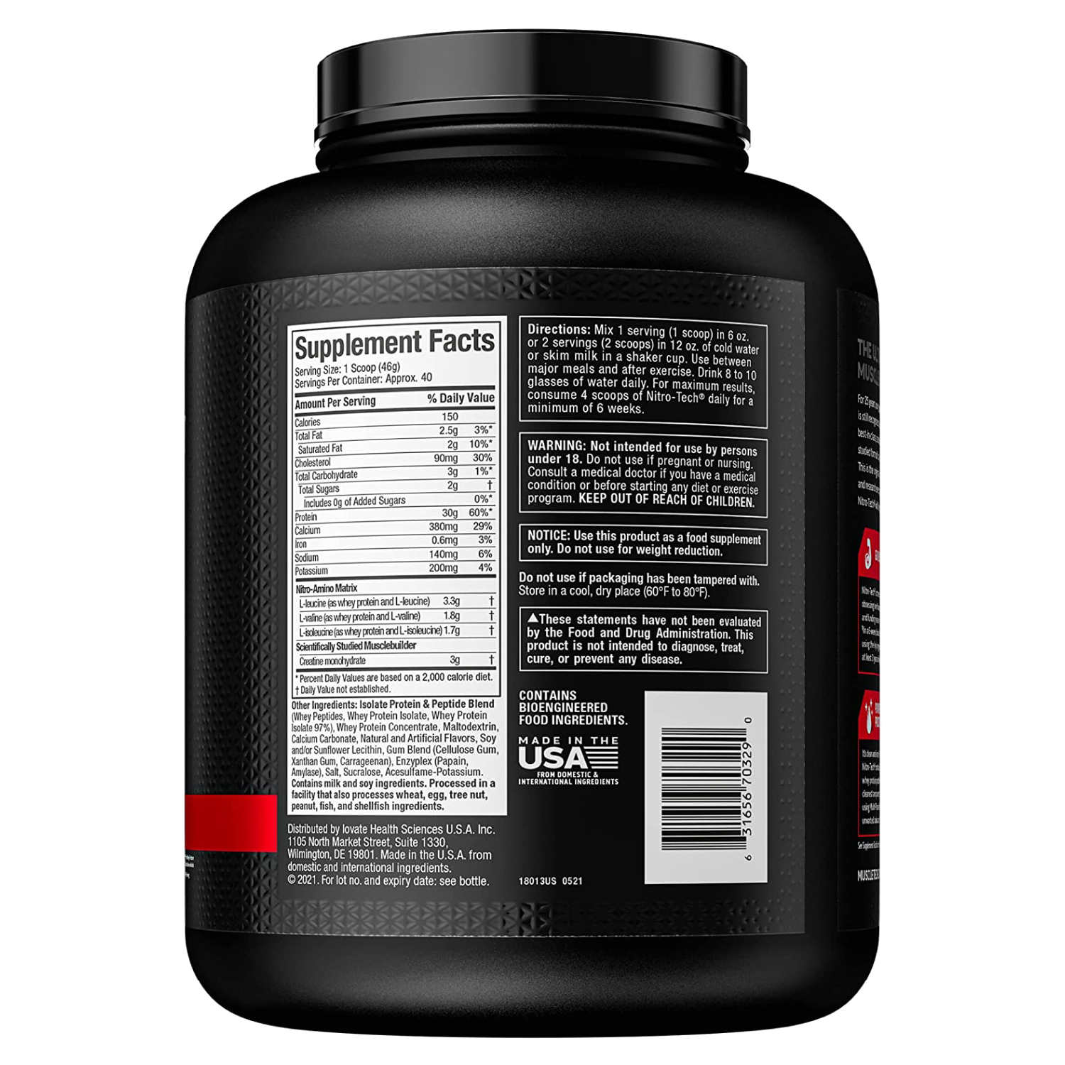For optimal results, mix 1 serving (1 scoop) of Muscle Tech Nitro Tech Performance Series Vanilla 4 Lb with 4 to 6 ounces (118-177 ml) of cold water or skim milk in a glass or shaker cup. For those seeking a higher protein intake, you may mix 2 servings (2 scoops) with 8 to 12 ounces (236-354 ml) of liquid. Use this supplement between major meals and after exercise for best results.