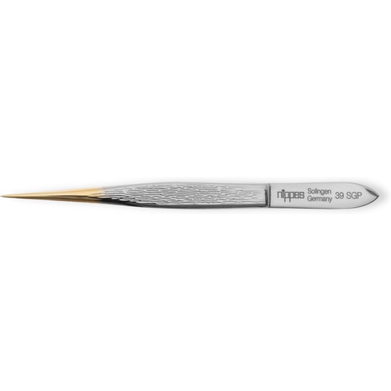 Classical tweezer with an pointed tip. This tweezer is optimal usable for remove splinters, single hairs and ingrown hairs. Made from high quality steel, nickel plated wiht an golden tip. Length: 9 cm