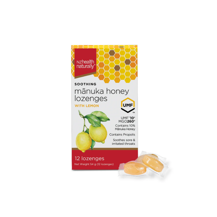 NZ Health UMF 10+ Manuka Honey Lozenges Lemon, Soothing Relief with Propolis, Menthol & Peppermint Oil - 12s