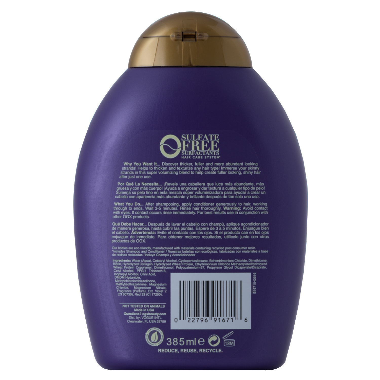 The collagen present in the conditioner used to add the volume and dimensions in thin and limp hair. Ogx Conditioner contains wheat protein which adds texture to hair of any type.