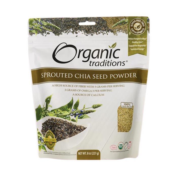 Sprouted Chia Seeds are a source of Calcium and Iron, a high source of Fiber and provide 3 grams of Omega-3 per 1 tablespoon 15-gram serving. These activated sprouted seeds deliver more nutrients per gram when compared to raw, non-sprouted chia seeds. The sprouting process improves digestibility and allows for greater absorption of nutrients. Enzyme inhibitors are liminated and anti-nutritive compounds such as phytic acid are reduced. The sprouting process not only dramatically increases vitamins and minerals in the seed, but it also doubles the antioxidant score (ORAC) making Sprouted Chia not only a nutritional powerhouse but also more shelf stable than raw NET WT. 8 (227 g) Chia seeds. Sprouted Chia Seeds contain bio-available protein, essential vitamins and minerals and an impressive host of antioxidants, giving them an ORAC value of 2,500 per 1 heaping tablespoon 15-gram serving. Aztec warriors would consume a mixture of Chia and water during hunting trips to ensure stamina and endurance. Simply add Organic Traditions Sprouted Chia powder to everything you eat to reduce the glycemic load of any recipe. This sprouted and cold-milled powder is a fast and simple way to enhance your daily diet with an extra boost of dense superfood nutrition.