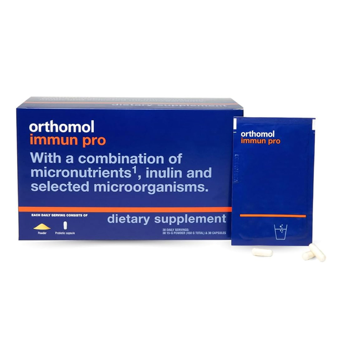 Support your immune system naturally with Orthomol Immun Pro Powder Capsules, formulated with vitamins, minerals, inulin, and probiotics including Bifidobacterium and Lactobacillus strains. Promotes gut health, strengthens immunity, protects cells from oxidative stress, and maintains healthy mucous membranes. Ideal daily support for overall immune wellness.