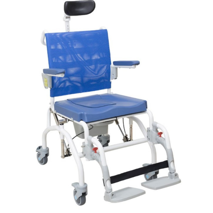 Tilt in space, easy to act by the caregiver, it promotes comfort and safety for the user, including users with poor trunk control. Robust stainless steel frame, anti-corrosion and high durability. Comfortable and detachable mesh back, easy to clean. Anatomical seat in integral skin, with opening and wedge. Removable bucket. Headrest height, depth and angle adjustable. Stainless steel gas pumps for tilt in space, actuated by handles. Seat height adjustable (10cm) for easy transfers. Foldable armrests. Detachable and height adjustable legrests. With 100mm wheels, all with brakes. Cleaning and disinfection resistant materials.
