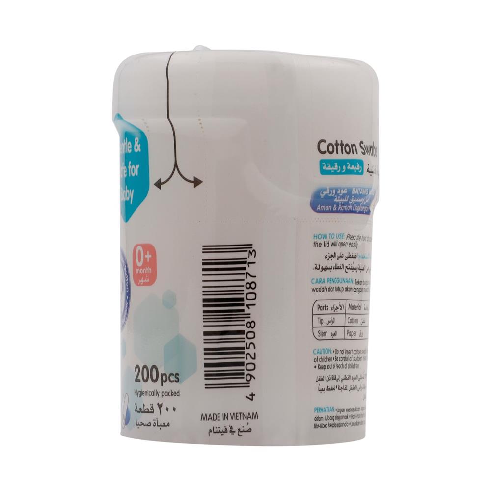 For easy cleaning of small areas like ears, nose or belly button Made from high quality 100% pure cotton Pliable soft paper stem provides added safety for babies Bio-degradable paper stems which are environmentally friendly Hinged plastic cases for convenient storage and easy retrieval of each swab Comes in extra thin stem for every greater flexibility and softness, suitable for newborn babies