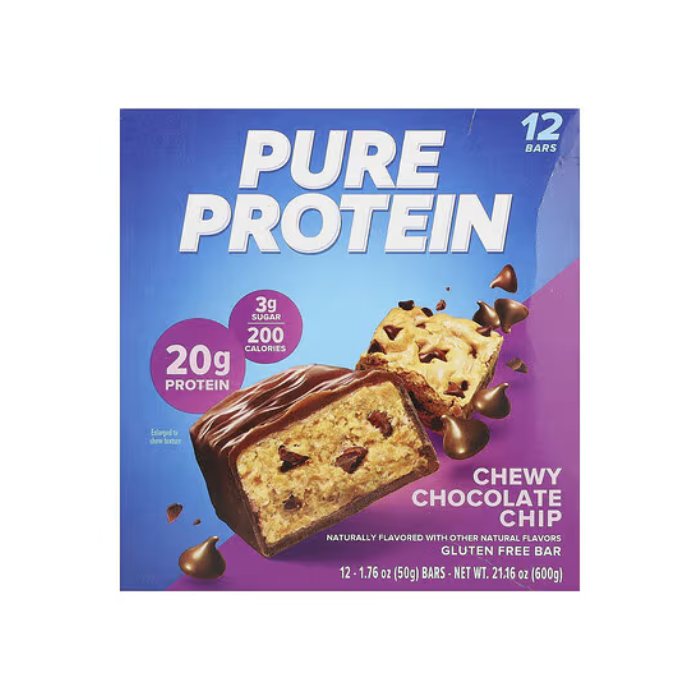 Enjoy delicious fuel with Pure Protein Chewy Chocolate Chip Bars. Each 50g bar packs 20g of protein with only 2g of sugar. Chewy, satisfying, gluten-free, and made for active lifestyles—perfect for pre/post workout or anytime snacking. Box contains 6 individually wrapped bars.