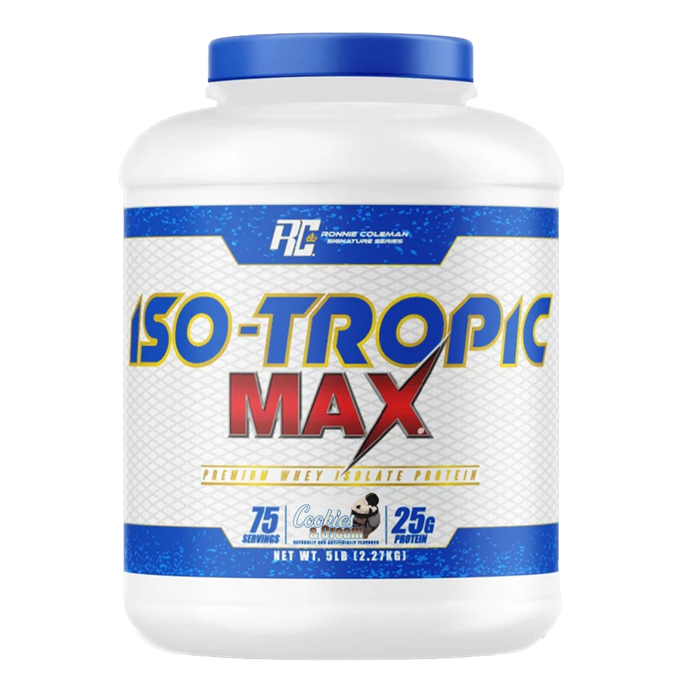 Unleash your full potential with Ronnie Coleman Iso Tropic Max Protein Cookies & Cream 5lb, a premium-grade whey protein isolate crafted to deliver maximum muscle recovery, lean growth, and performance results. Formulated by 8X Mr. Olympia Ronnie Coleman, this advanced isolate powder provides 25g of pure whey isolate protein per serving — ensuring rapid digestion and superior amino acid delivery to your muscles when they need it most. Designed for athletes, gym-goers, and fitness enthusiasts, Iso Tropic Max fuels your body with clean, high-quality protein while keeping fat, sugar, and carbohydrates to a minimum. Each serving offers only 120 calories and 1g of sugar, making it ideal for lean bulking, cutting, or maintaining a toned physique.