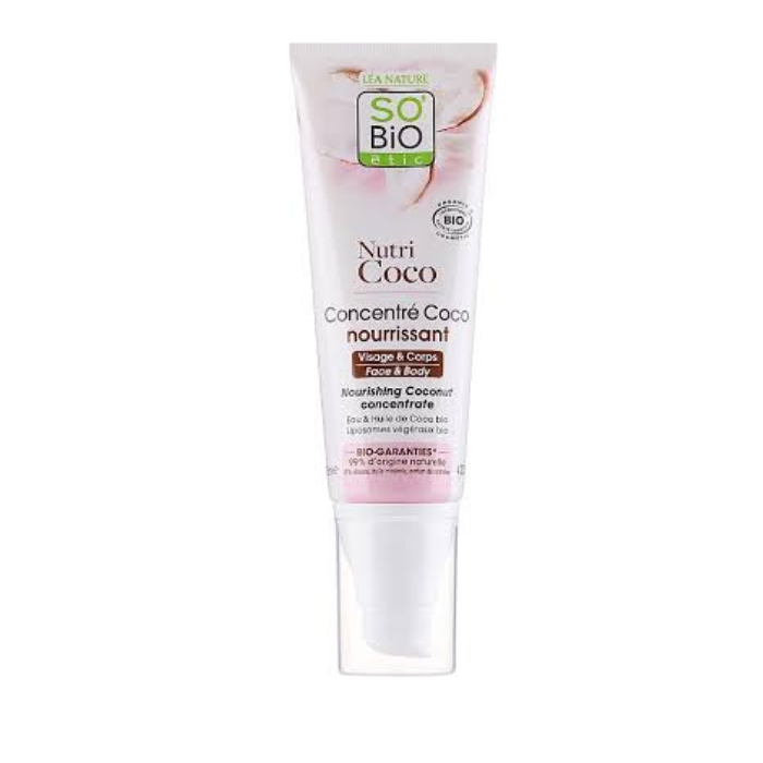 Pamper your skin with So Bio Etic Organic Nutri Coco Nourishing Concentrate, a multi-purpose moisturizer for face, body, and hands. Enriched with organic coconut water and oil, and infused with plant-based liposomes, it deeply nourishes, repairs, and hydrates dry or sensitive skin. Certified organic and made with 99% natural origin ingredients, its light, non-greasy texture instantly soothes and restores softness all year round. Free from silicones, mineral oils, and synthetic fragrance.
