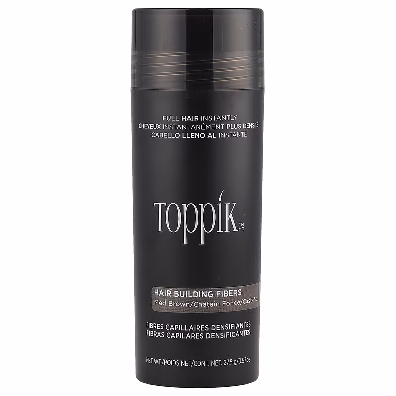 Toppik Hair Building Fibers, made of colored keratin protein, blend undetectably with existing hair strands to instantly create the appearance of naturally thick, full hair.