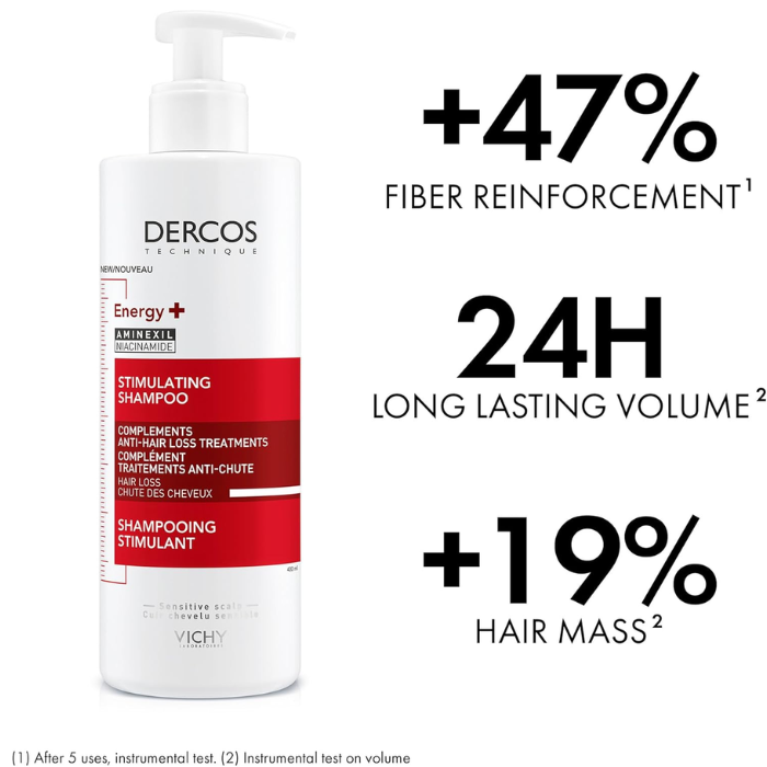 Vichy Dercos Energy+ Anti-Hairloss Shampoo 400ml is designed to reduce the rate of hair loss and maintain the density of thinning hair due to hair breaking*. Enriched with patented molecule Aminexil, Vitamins B3, B6 and Provitamin B5, the shampoo reinforces and protects to leave hair feeling nourished and revitalised.
