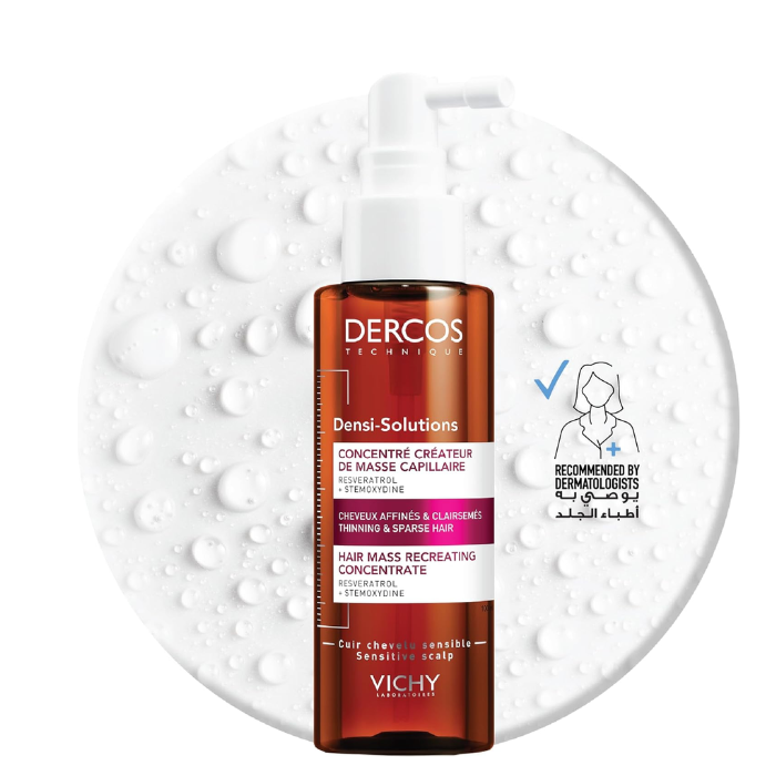Rediscover fuller, thicker-looking hair with Vichy Dercos Densi-Solutions Hair Mass Recreating Concentrate 100ml, a scientifically advanced scalp treatment designed for thinning and sparse hair. This high-performance concentrate combines Stemoxydine, a patented densifying molecule, with powerful antioxidant Resveratrol to help regenerate hair mass by acting directly at the root. The result is an increase in the number, thickness, and strength of your hair strands over time.