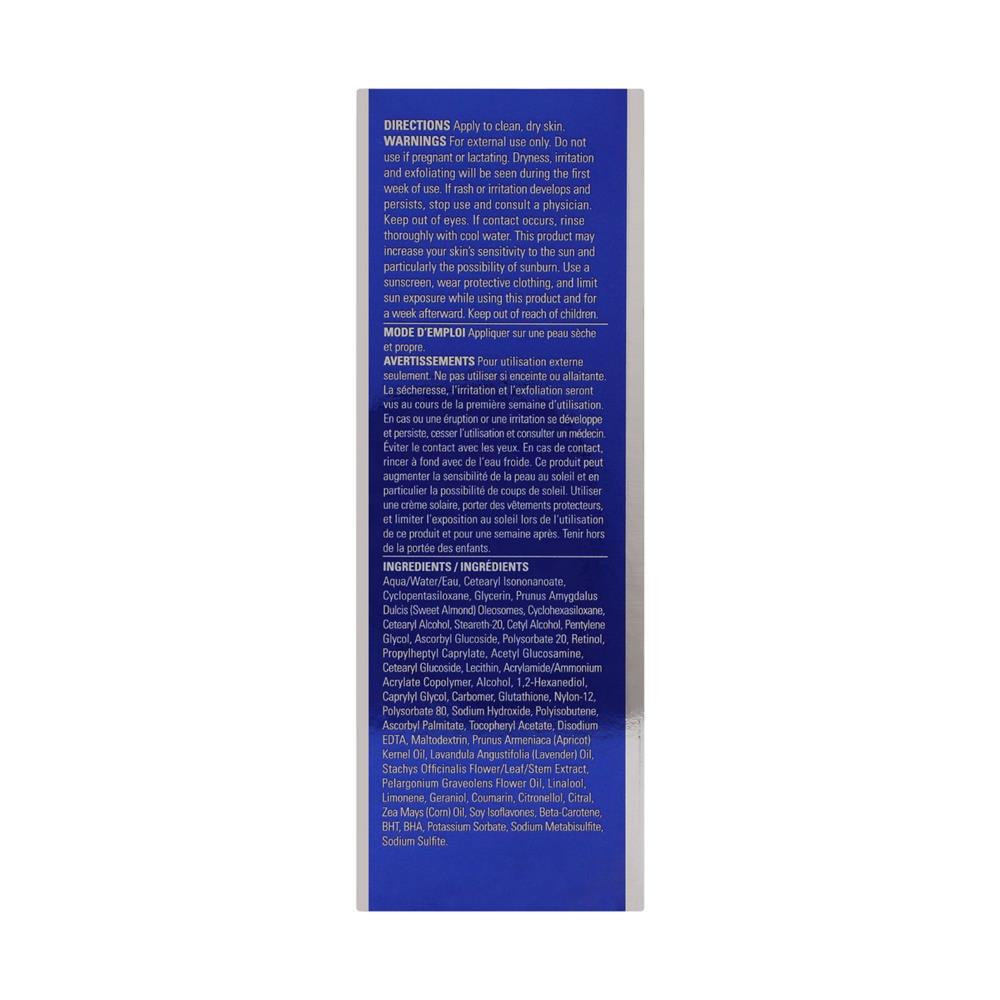 Ingredients : Water/Aqua/Eau, Dimethicone, Cetearyl Isononanoate, Glycerin, Prunus Amygdalus Dulcis (Sweet Almond) Oil, Cetearyl Alcohol, Cetyl Alcohol, Steareth-20, Pentylene Glycol, Ascorbyl Glucoside, Acrylamide/Ammonium Acrylate Copolymer, Polysorbate 20, Retinol, Prunus Armeniaca (Apricot) Kernel Oil, Pelargonium Graveolens Flower Oil, Lavandula Angustifolia (Lavender) Oil, Propylheptyl Caprylate, Bakuchiol, Acetyl Glucosamine, Cetearyl Glucoside, Lecithin, Polyisobutene, Alcohol, Glutathione, Carbomer, Caprylyl Glycol, Bisabolol, 1,2-Hexanediol, Silica, Polysorbate 80, BHT, Pentaerythrityl Tetra-di-t-butyl Hydroxyhydrocinnamate,Disodium EDTA, Sorbitan Isostearate, Gluconolactone, Tocopheryl Acetate, Sodium Sulfite, Sodium Metabisulfite, Ascorbyl Palmitate, Soy Isoflavones, Sodium Hydroxide, Potassium Sorbate, Sodium Benzoate, Linalool, Citronellol, Geraniol, Limonene, Citral, Coumarin.